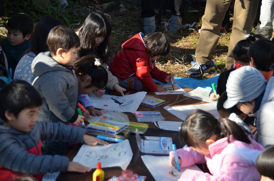 事務所では凧の作成手順に関する説明のあと、材料となる和紙と竹が配られた。なんでも、真っ白の凧は縁起が悪いとのこと。参加者は用意されたマジックやサインペンで、それぞれ思いおもいの図柄を描きはじめた。