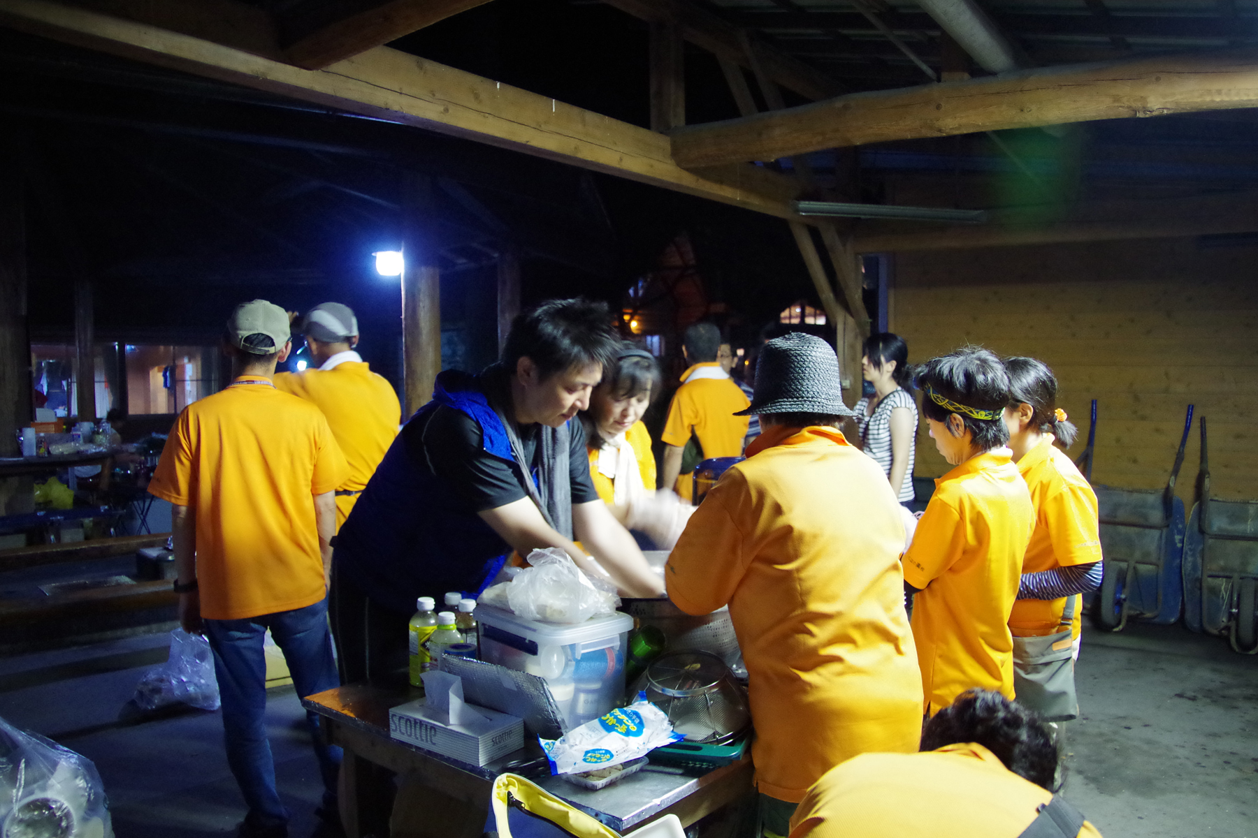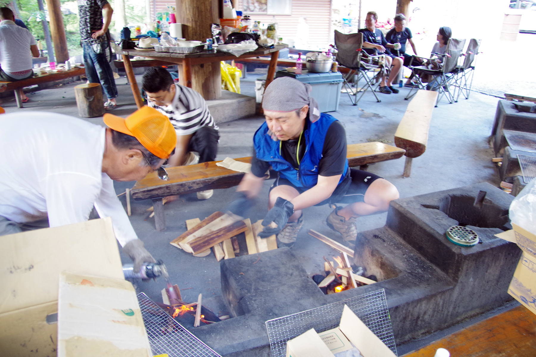 安全教室とカヌー教室を終えキャンプ場へ戻った参加者は夕食のバーベキューの準備へ。スタッフが事前に調理した牛肉・豚肉、手羽先などを次々と焼き上げていった。
