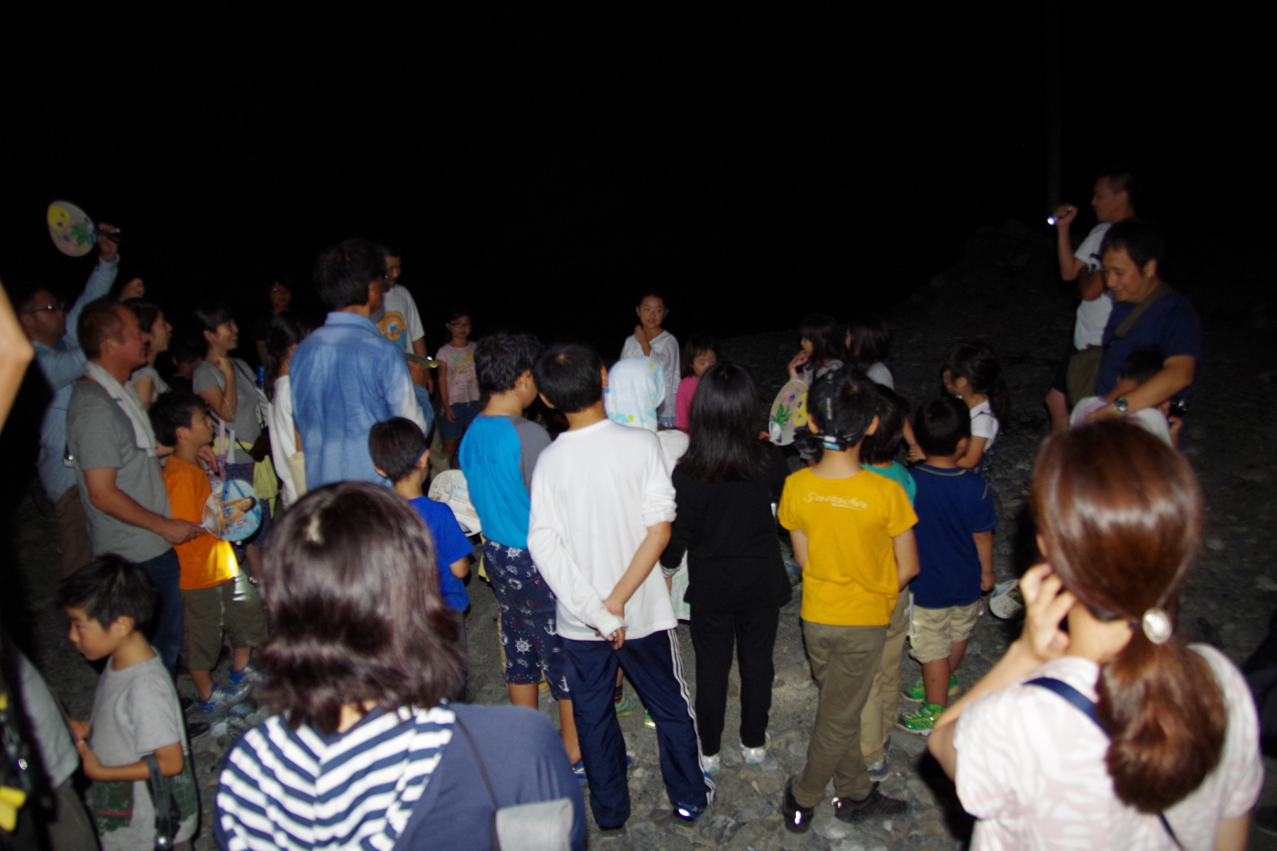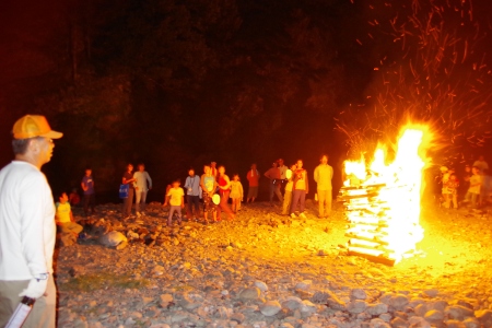 バーベキューのあとはキャンプファイヤーと天体観測へ。なかなか火が付かなかったキャンプファイヤーも、皆で扇ぎ大成功。天体観測では講師の準備した巨大望遠鏡を使って夏の夜空を満喫し、キャンプ初日を締めくくった。