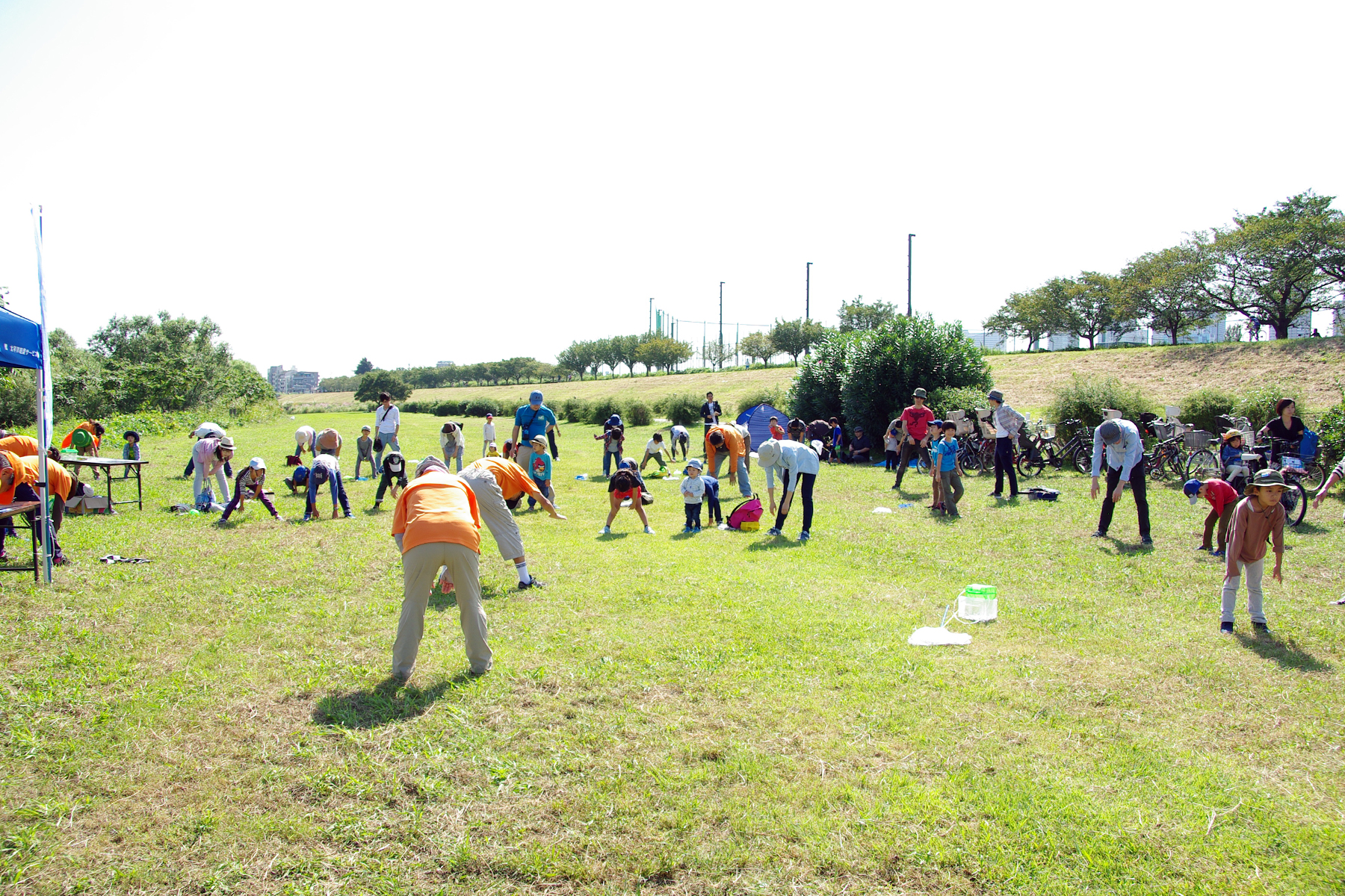 2017年10月1日(日)、秋の爽やかなお天気のもと、多摩川丸子橋下河川敷にて『昆虫観察』を開催した。まず講師・スタッフ紹介を行い、恒例のラジオ体操で身体をほぐした。