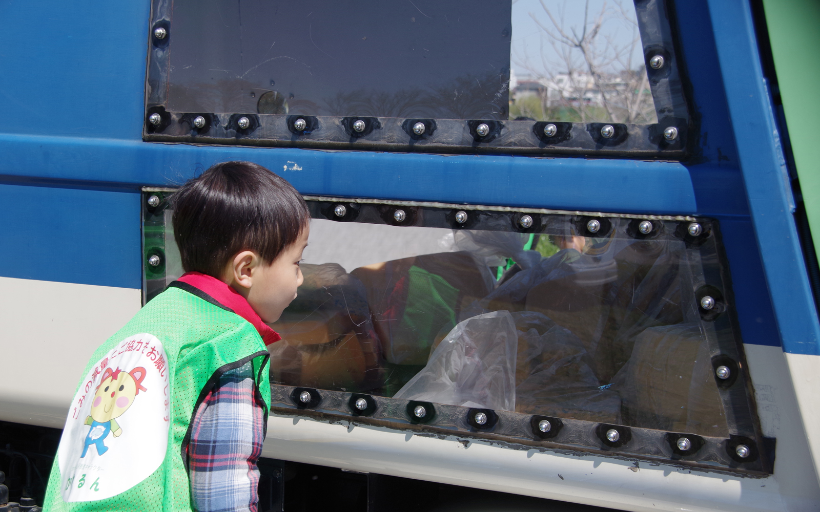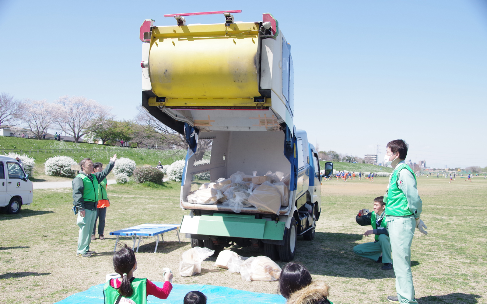 続いて川崎市中原生活環境事業所の皆様が用意してくれたスケルトン清掃車を使って清掃車の仕組みを教わった。参加者は、一人ひとりゴミに見立てたスポンジをゴミ投入口に入れ、ボタンを押して動作させる。するとスポンジが内部に回収されるが、スケルトン清掃車は、横側など外装の一部が透明になっているため、この一連の流れは清掃車の外から見ることができる。